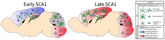 Summary of glial changes in SCA1 across brain regions and disease stages.