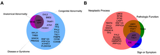 IIIG9-interactor proteins organized into semantic groups (UMLS®) of diseases extracted using DisGeNet (A,B) Interactors were experimentally validated (yeast via two-hybrid and affinity capture—MS methods). The semantic groups correspond to concept unique identifiers from the Unified Medical Language system® (UMLS) Metathesaurus ® (version UMLS 2018AA).