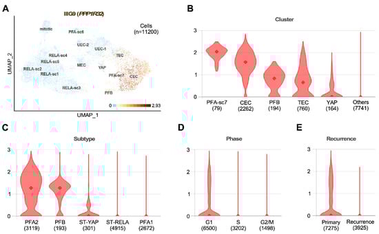 IIIG9 expression is restricted to ciliated ependymoma cells of the posterior fossa. (A) Harmony alignment projection of scRNA-seq analysis of 26 pediatric patients with ependymoma (EPN). IIIG9 (PPP1R32) expression is shown in the brown color range and corresponds to the values generated by the adaptive threshold low-rank approximation (ALRA). (B–E) IIIG9 expression ALRA range is shown by cluster (B), subtype (C), phase (D), and recurrence (E) The number of cells in each selection is placed in brackets (n = 11200 cells). Seven subgroup clusters of posterior fossa group A (from PFA-sc1 to PFA-sc7), five subgroup clusters of ZFTA-RELA group (from RELA-sc1 to RELA-sc5), one posterior fossa group B (PFB), and one YAP-MAMLD1 group (YAP) are shown. Five PFA subgroup clusters correspond to ciliated EPN cells (CEC), transporter EPN cells (TEC), mesenchymal EPN cells (MEC), and undifferentiated EPN cells 1 and 2 (UEC-1 and EC-2, respectively); cells are in mitosis (mitotic). Uniform manifold approximation and projection (UMAP) was used for classification. The database was generated by Gillen and colleagues [105] and is available in the browsable web resource of the full EPN scRNA-seq dataset at the Pediatric Neuro-oncology Cell Atlas [107].