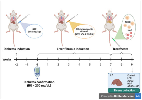 After overnight fasting, mice were intraperitoneally (i.p.) injected with a single dose of streptozotocin (STZ; 102 mg/kg b.w.), freshly dissolved in citrate buffer (50 mM, pH 4.5) to induce diabetes [44]. Blood glucose levels were measured after 4 h of fasting by using a one-touch glucometer. After STZ administration, mice with a fasting blood glucose level higher than 200 mg/dL for 2 consecutive weeks were considered diabetic mice. Confirmed diabetic mice were further treated i.p. with CCl4 dissolved in olive oil (20% v/v, 2 mL/kg), twice a week for 7 weeks, and euthanatized 72 hours after the last injection for confirmation of liver fibrosis (liver fibrosis diabetes mice: LF), according to our previous work [45]. Spontaneous resolution of hepatic fibrosis was investigated in CCl4-treated diabetic animals after 2 weeks of self-recovery (liver fibrosis control diabetes mice: LFC). The treatments started on week 7, at the end of the CCl4 administration, and received: ADSCs cells (1.0 × 106 cells/100 μL PBS; Thermo Fischer Scientific, R7788115) by i.v. injection on the tail vein, on week 7 (ADSCs diabetes mice: ADSC); hepatocyte growth factor (150 μg/kg) by i.v. injection on the tail vein, on week 7 (HGF diabetes mice: HGF); and ADSCs plus HGF in the same doses as previous groups administrated by i.v. injection on the tail vein, on week 7 (ADSCs and HGF diabetes mice: ADSC + HGF) (Figure 1). The control group received saline solution. After blood collection, the animals were euthanized by administering an overdose of ketamine. Our preliminary studies established the HGF dose and according to a previous data field [39,46].