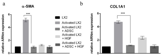 The immunofluorescence staining results were confirmed by gene expression results. Gene expression evaluation by qPCR was conducted for α-SMA and COL1A1 (Figure 5). The elative gene expression of α-SMA was statistically significantly increased ~5x in HSCs after TGF-β1 treatment (Figure 5a). In HSCs cocultured with ADSCs, α-SMA expression was statistically significantly (p < 0.001) reduced to levels similar to control. Additionally, the expression of α-SMA was statistically significantly (p < 0.001) reduced after treatment with HGF as well as when HSCs were both cocultured with ADSCs and treated with HGF. This confirms the IF results and suggests the role of ADSCs’ secretome and HGF in stimulating aHSCs’ reversion. In addition, the expression of col1a1 was also assessed, and the COL1A1 results of IF were confirmed at gene levels as well. The expression of col1a1 was upregulated after TGF-β1 treatment, which was later statistically significantly downregulated (p < 0.001) upon coculture with ADSCs, but also in the presence of HGF, suggesting the effect of ADSCs’ secretome and HGF on the secretion of extracellular matrix components.