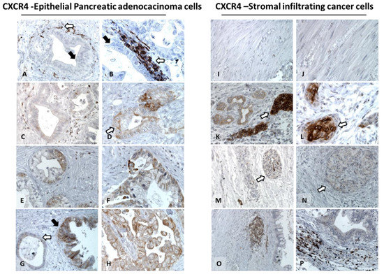 CXCR4 expression in epithelial and stromal PDAC cells. Representative expression in PDAC (200× and 400× magnification). Left panel: CXCR4-negative PDAC (A) and positive lympho-monocytic cells (white arrow) (B). CXCR4 low, cytoplasmic, and few membrane stainings (white arrow) (C,D). CXCR4 moderate expression, heterogeneous mild diffusion, and intensity of membrane and cytoplasmic (E,F). CXCR4 high expression, featured by a diffuse and strong membrane, cytoplasmic staining (black arrow), compared to the adjacent lesion with a low degree of cytological and architectural degeneration and low CXCR4 expression (white arrow) (G,H). TME analysis (right panel): Fibrotic stroma negative (I,J), CXCR4 expression in acinar cells (white arrow) (K,M). Islets of Langerhans (white arrow) (M,N) with faint CXCR4 surrounded by negative fibrotic stroma (white arrow), clear CXCR4 expression in lymphocytic monocytes, and endothelial infiltration (O,P).