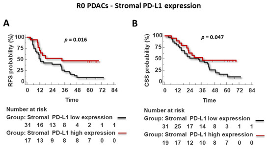 While the expression of the CXCR4-CXCL12-CXCR7 axis or PD-L1 in stromal cells was not prognostic in the whole cohort (Supplementary Figure S1), we found a significant association of high stromal lymphocytic-monocytic PD-L1 expression with improved RFS (p = 0.016) and CSS (0.047) in R0 patients, (Figure 7).