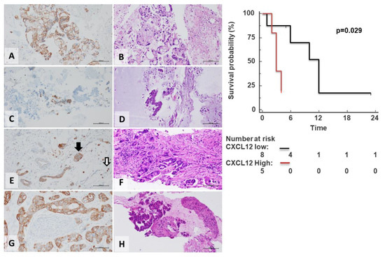 Follow-up was available for 13 patients. A total of 7 patients died (53.8%), showing a median overall survival of 6 months. The patients with a high sharp, consistent distribution of CXCL12 expression showed short CSS with a median survival of 3 months, while low/negative CXCL12 expressing displayed short CSS with a median survival of 12 months (p = 0.029) (Figure 8).