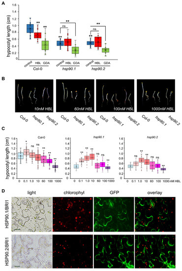 Concentrations of HBL higher than 10 nM, significantly decreased the hypocotyl growth of etiolated wild-type seedlings (Figure 1B,C and Figure S1B). Interestingly, under HBL concentrations up to 10 nM, the HBL dose response of hypocotyl growth was significantly increased in both hsp90 mutants. However, a significant reduction of hypocotyl elongation was noticeable at the highest HBL concentration (Figure 1B,C and Figure S1B,C)