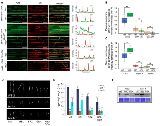 Our results demonstrated a critical and distinctive role of HSP90 in the regulation of BRI1/BAK1 abundance at the PM, pointing to an intertwined activation of the receptors in the presence of the appropriate stimulus. In this context, we analyzed the profiles of BRI1-GFP signal intensity at the PM of 5-day-old etiolated seedlings treated with HBL after the application of GDA. In agreement with previous findings [42], BRI1-GFP fluorescence showed distinct foci of signal distribution at the PM under resting conditions, as evidenced by the qualitative presentation of the fluorescence intensity (Figure 5A and Figure S6A). Application of HBL increased the intensity and altered the distribution of BRI-GFP at the PM (Figure 5A,E and Figure S6B,I), while application of GDA significantly decreased the BRI1-GFP fluorescent intensity at the PM and altered its distribution (Figure 5B,E and Figure S6C,I). To investigate the impact of the depleted function of HSP90 in BR response, we applied HBL in etiolated wild-type seedlings pretreated with GDA. Our findings showed that HBL application upon GDA treatment significantly induced the heterogeneous distribution of BRI1-GFP foci at the PM (Figure 5B and Figure S6D).