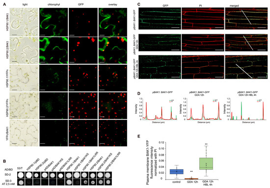 The role of HSP90 in the association of BRI1 with BAK1 at the PM is further supported by previous studies that analyzed the mode of function of TWD1, a co-chaperone of HSP90, in the association of BRI1 and BAK1 [71,72]. The activity of TWD1 is critical for the autophosphorylation of the two receptors after the ligand binding and the maintenance of the BAK1 co-receptor in a signaling-competent state at the PM. The presence of the hyperphosphorylated forms of BZR1 in twd1 mutants indicates a positive role for TWD1 in BR signaling upstream of BIN2 [71]. Thereby, TWD1 activity mediates the linking of different signaling pathways facilitating protein–protein interactions within functional networks [73]. Our findings also suggest a similar role for HSP90 in the formation of BRI1 and BAK1 complexes.