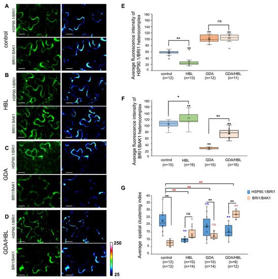 We assessed the interaction intensity of BRI1/BAK1 and we showed that HBL treatment increased the interaction between BRI1 and BAK1 in agreement with previous findings [42]. Application of GDA resulted in a weak interaction between them (Figure 6A–C,F and Figure S8A–C). Treatment with HBL in the presence of GDA reinforces the formation of BRI1/BAK1 heterodimer (Figure 6A,D,F and Figure S8A,D). Consistent with these results, pharmacological inhibition of HSP90 also abolishes the association of HSP90.2 with the BRI1 receptor, even though under control conditions the intensity of the HSP90.2/BRI1 interaction was significantly greater than that of HSP90.1/BRI1 and comparable to BRI1/BAK1 (Supplementary Figures S8E and S9). Our results suggest that BRI1/BAK1 heterodimerization depends on the activity of HSP90.