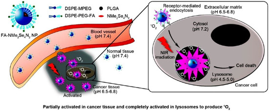 FA-NMe2Se4N2 NPs partially activated in cancer tissue and completely activated in lysosomes to produce 1O2 [54]. FA-NMe2Se4N2 NPs for highly selective Near-Infrared PDT against tumor.