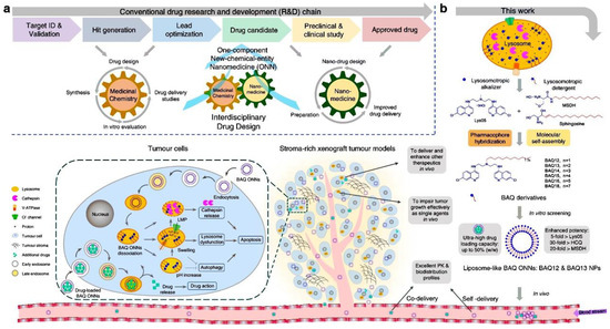 In the past few decades, the continuous development of nanomedicine has made many contributions to tumor treatment. Researchers are developing carrier-assisted and carrier-free nanomedicines to improve drug intrinsic kinetics and safety [67,68,69,70,71]. However, these nanotherapeutics still have some limitations. For example, due to the multicomponent nature of nanotherapy, its complexity and toxicity seriously hinder the clinical transformation of many nanopreparations [72]. Some drugs that were used in nano-carrier delivery studies are no longer suitable for clinical anti-tumor therapy [73,74,75]. Additionally, due to the complexity of drug structures, they are difficult to modify. These limitations hinder the development of nano-drugs, but these problems are likely to be solved with pharmaceutical chemistry [76]. Nanomedicine mainly focuses on nano-drugs and nanocarriers. Pharmaceutical chemistry is committed to finding safe and effective drugs [76,77]. Drug discovery technology has developed a large number of lead drugs and drug candidates. However, it remains challenging in terms of pharmacokinetics, metabolism and toxicology [78,79]. We can find solutions to these challenges through the field of nanomedicine. Therefore, Ma et al. leveraged the relationship between these two disciplines to combine nanotechnology with initial drug design to develop a one-component new-chemical-entity nanomedicine (ONN) strategy [80]. This strategy not only follows the traditional drug design strategy but also the principle of molecular self-assembly. Drugs designed with this strategy have advantages in terms of drug discovery and delivery. They designed a series of lipophilic cationic bisaminoquiniline (BAQ) derivatives by pharmacophore hybridisation and molecular self-assembly [81,82]. Because BAQ12 and BAQ13 have the potential to be therapeutic agents and are self-assembled components, they were chosen as ONNs. Studies have found that these BAQ ONNs can destroy lysosomes, lead to lysosome dysfunction and inhibit autophagy (Figure 4). BAQ ONNs showed a clear antitumor effect in vitro. Additionally, as nano-drugs, BAQ ONNs are adept at self-delivery [80]. From a drug discovery and drug delivery perspective, these advantages enable the remarkable anticancer activity of BAQ ONNs as a single agent in an in vivo gastrointestinal cancer model.