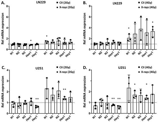 Differential regulation of Notch signaling genes by CII and X-rays in human glioma cell lines: The mRNA expression of Notch receptors (relative to un-irradiated sample): Notch1 (N1), Notch2 (N2), and Notch3 (N3); Notch target genes: Hes1 and Hey1, observed at 24 h after irradiation were analyzed by qRT-PCR in LN229 and U251 monolayer cell culture irradiated with either (A,C) 2 Gy X-ray or carbon ion irradiation or; (B,D) 4 Gy X-ray or carbon ion irradiation. Each symbol represents an independent experiment performed in triplicate. Data are presented as mean ± SD. p values were determined by an unpaired two-tailed Student’s t-test, * p < 0.05, ** p < 0.01.
