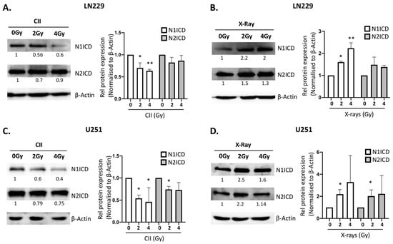 Photon irradiation was demonstrated to upregulate Notch signaling in cancer, which was linked to the therapy induced development of radioresistance [16]. To investigate the effect of CII on Notch signaling, we analyzed the dose-dependent changes in the mRNA levels of Notch receptors (Notch1, Notch2, and Notch3) and target genes (Hes1 and Hey1) in LN229 and U251 cells and compared them with the changes following X-ray irradiation in these two cell lines. In LN229 cells, X-rays upregulated the mRNA expression of Notch1 and Hey1 genes in a dose-dependent manner observable at 24 h post irradiation, whereas no significant modulation was detectable for other Notch receptors and targets (Figure 1A,B). Interestingly, with CII, no significant upregulation of either Notch receptors or targets was observed (Figure 1A,B). Moreover, Hes1 mRNA was reduced at 24 h following 2 Gy CII (Figure 1A), while the levels of Hes1, Notch2, and Hey1 were reduced at 6 h following 2 Gy and 4 Gy CII (Figure S1A,B). In U251, X-ray induced the mRNA expression of Notch1, Notch2, and Notch3 receptors in a dose-dependent manner, while the targets genes were not affected at 6 h (Figure S1C,D). At 24 h after X-ray irradiation, only Notch2 and Hes1 were upregulated (Figure 1C,D). Similar to LN229, CII either had no effect on the Notch receptor and target gene expression or reduced the Notch1 and Hey1 at 6 h (Figure S1C,D) or Hes1 and Hey1 at 24 h (Figure 1C,D) in U251 cells. These differential effects of CII and Xray on the mRNA expression of Notch receptors and targets genes were also observed in U87 cells lines (Figure S2). At 6 h after irradiation, only Notch2 and Hey1 were significantly reduced by 4Gy CII, while other Notch receptors or target genes were not modulated by either CII or X-ray (Figure S2A). However at 24 h, 4Gy X-rays significantly induced the expression of Notch receptors (Notch1, Notch2, and Notch3) and target genes (Hes1 and Hey1), while 4Gy CII reduced Notch2 and Hey1 (Figure S2B). In LN229 and U251 cells, we also examined the mRNA expression of Notch ligands after CII or X-ray irradiation at 6 h or 24 h. While CII did not modulate any Notch ligands in LN229 or U251 at 6 h or 24 h (Figures S3 and S4), X-rays at 2 Gy induced Dll4 at 6 h and Dll1 at 24 h in LN229 cells (Figure S3A,C), while a significant induction of Jag1 mRNA expression was noted with 4 Gy X-rays at 6 h and 24 h in LN229 cells (Figure S3B,D). In U251, only 4Gy X-rays induced the Dll1, Dll4, and Jag1 mRNA expression at 24 h (Figure S4D), while at other doses and time points, no significant modulation of Notch ligands was observed in U251 (Figure S4A–C). As Notch1 and Notch2 play a major role in the glioma tumorigenesis and in therapy resistance, we next examined the effects of X-rays and CII on the protein expression of NOTCH1 and NOTCH2 receptors. An increase in the protein levels of NOTCH1 intracellular domain (N1ICD) was observed at 24 h following X-rays in both LN229 and U251 cell lines (Figure 2B,D), while NOTCH2 intracellular domain (N2ICD) was increased only in U251 (Figure 2D). Moreover, an increase in the protein levels of activated NOTCH1 as detected by antibody against NOTCH1Val1744 was observed at 24 h following X-rays in both LN229 and U251 cell lines (Figure S5B,D). Interestingly, the N1ICD protein level and activated NOTCH1 were reduced by CII at 24 h in a dose-dependent manner in both the cell lines (Figure 2A,C and Figure S5A,C). The N2ICD protein level was reduced in U251 by CII (Figure 2C), while it remained unaltered in LN229 cells (Figure 2A). In U87, a similar effect of CII and X-ray was observed on the protein expression of N1ICD (Figure S2C). These results suggest that X-ray and CII differentially regulate the mRNA expression and protein levels of the Notch receptor and target gene in these glioma cell lines.