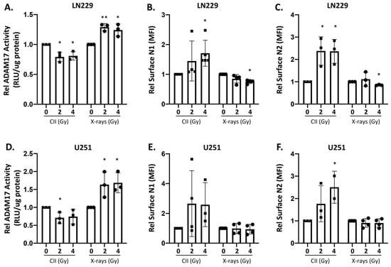 Differential regulation of ADAM17 activity and cell surface Notch receptors by CII and X-rays in human glioma cell lines: Relative ADAM17 activity at 24 h after irradiation with CII and X-rays in (A) LN229 and (D) U251 cells. Relative MFI of cell surface NOTCH1 receptor (N1) in (B) LN229 and (E) U251 and NOTCH2 receptor (N2) in (C) LN229 and (F) U251, as determined by flow cytometry at 24 h after irradiation with CII and X-rays. Each symbol represents an independent experiment. Data are presented as mean ± SD. Statistical analysis was performed by ANOVA with Bonferroni post-hoc test. p-values (* p < 0.05, ** p < 0.01).