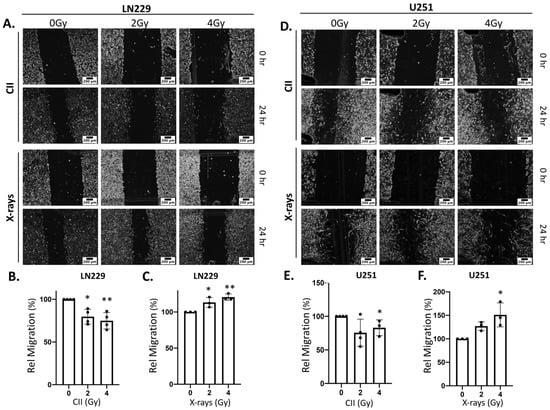 CII reduces while X-rays enhances migration of LN229 and U251 glioma cells: Representative images of the (A) LN229 and (D) U251 glioma cell migration after irradiation with CII or X-rays as analyzed by scratch assay (scale bar in black = 200 μm); (B) Bar graph showing the relative migration of LN229 irradiated with CII as derived from panel (A); (C) Bar graph showing the relative migration of LN229 cell irradiated with X-rays as derived from panel (A); (E) Bar graph showing the relative migration of U251 cell irradiated with CII as derived from panel (D); (F) Bar graph showing the relative migration of U251 cell irradiated with X-rays as derived from panel (D). Each experiment was performed in duplicate. Each symbol in the bar graph represents an independent experiment. Data are represented as ± SD. Statistical analysis was performed by ANOVA with Bonferroni post-hoc test. p-values (* p < 0.05, ** p < 0.01).