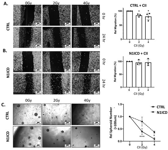 Radiation-induced migration and acquisition of the stem phenotype are still the major contributing factors that are involved in the development of radioresistance and tumor resurgence after radiotherapy [23]. Moreover, these two cellular events are well known to be regulated by Notch signaling [6]. Therefore, to investigate the functional impact of the CII-mediated reduction in NICD, we examined radiation-induced migration and acquisition of the stem phenotype in glioma cell lines. We used the spheroid forming ability of the glioma cell line post irradiation to access the radiation-induced acquisition of stemness because it is one of the most dependable and proven parameters to assess the stemness of the cancer cells. Interestingly, CII reduced the migration of the LN229 cell line (Figure 4A,B), whereas X-ray promoted the LN229 cell migration at both doses (Figure 4A,C). A similar effect on the migration of U251 cell lines was observed with CII (Figure 4D,E) and X-rays (Figure 4D,F). CII also affected the spheroid forming ability of LN229 and U251 cell lines post irradiation. As shown in Figure 5A,B, CII significantly reduced the spheroid formation of LN229 and U251, while this effect was not observed with the X-ray. These findings imply that CII and X-rays have differential effects on migration and spheroid formation in glioma cell lines, thus, matching the differential impact of CII and X-ray on Notch signaling.
