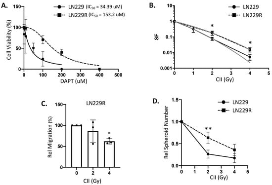 Notch inhibitor (DAPT) resistant glioma cell line (LN229R) is less responsive to CII-mediated effects: (A) Cell viability of parental LN229 vs. DAPT resistant LN229R cell lines as measured by Cell Titre Lumi after 72 h incubation in different concentration of DAPT; (B) Clonogenic survival curve of LN229 (solid black line) and LN229R (dashed black line) glioma cell lines exposed to different doses of CII, the grey line represents the linear quadratic (LQ) fitted survival curve; (C) Relative migration of LN229R cell line at 24 h exposed to different doses of CII. Each symbol represents one independent experiment. Each experiment was performed in duplicate; (D) Relative spheroid number of LN229R glioma cell line at day 10–14 after irradiation with CII. Each experiment was performed in triplicate. Data are from 3–4 independent experiments and presented as mean ± SD. Statistical analysis was performed by ANOVA with Bonferroni post-hoc test. p-values (* p < 0.05, ** p < 0.01).