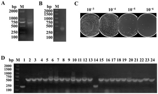 Construction of VHH library. (A,B) VHH genes were generated by a two-step nested PCR. (C) The library size was measured by counting the clone numbers using the gradient dilution method. (D) The correct insertion rate was estimated by randomly selecting 24 colonies and performing PCR. M: DNA marker DL 2000.
