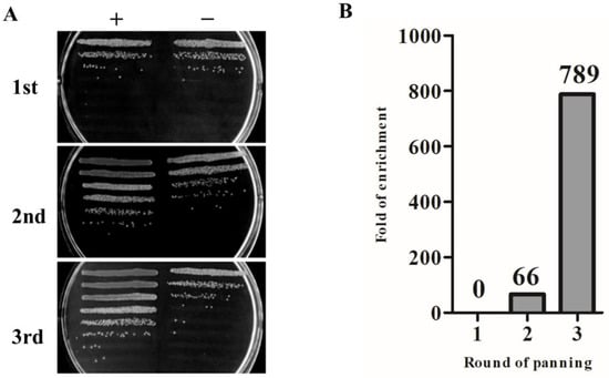The enrichment effect of SARS-CoV-2 S-RBD phage display nanobody library after affinity screening. (A) The enrichment result was displayed for three rounds of panning. (B) The statistical result for enrichment fold. +: positive screened phage; −: negative screened phage.