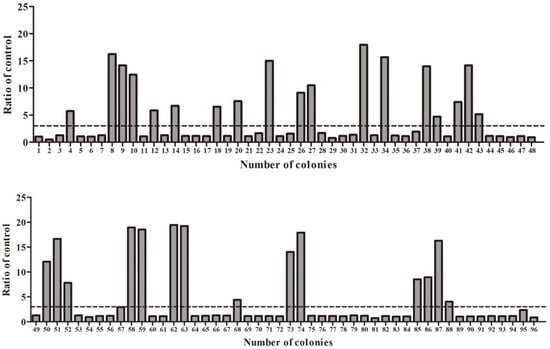 PE-ELISA for the identification of positive colonies. A ratio of higher than 3 was considered positive.