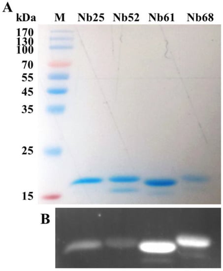 Identification and purification of SARS-CoV-2 S-RBD Nbs. (A) SDS-PAGE gel for SARS-CoV-2 S-RBD Nbs (Nb25, Nb52, Nb61, and Nb68). (B) Western-blotting assay for confirming the carrying of His-tag of these four Nbs. M: protein marker (10–170 kDa).