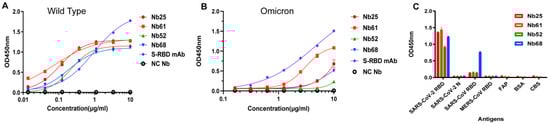 Indirect ELISA to identify the affinity of Nbs to SARS-CoV-2 S-RBD. (A) The binding affinity of Nbs to SARS-CoV-2 S-RBD (Wild Type); (B) the binding affinity of Nbs to SARS-CoV-2 S-RBD (Omicron); (C) the specificity of Nbs to SARS-CoV-2 S-RBD; commercial anti-SARS-CoV-2 RBD mAb was used as the positive control. The OD450 values were the means ± SD values from triplicate measurements.