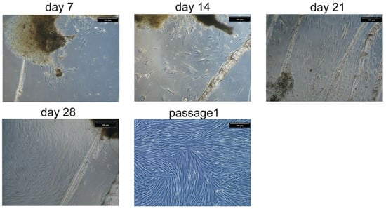 Figure 2. Representative photos of cell isolation from bone explants. Scrapes on the culture flask surface help to fix bone pieces. First cells were observed at 3–7 days of isolation. It takes 4–5 weeks before cells reach confluence and could be passaged. After passaging cell culture becomes more homogenous.
