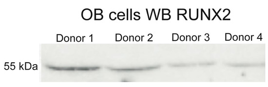 The OB cells were seeded in gelatin-coated 6-well plates at a density of 200 × 103 cells per well in standard conditions for 96 h. The cells were treated with 150 μL of RIPA Buffer (Sigma Aldrich, St. Louis, MO, USA) and a protease inhibitor cocktail. The total protein level was measured by BSA assay kit (Thermo Scientific, Waltham, MA, USA) using Varioscan (Thermo Scientific, Waltham, MA, USA). An equal amount of protein from each donor was used for the assay. Extracts were separated by 10% sodium dodecyl sulfate-polyacrylamide gel electrophoresis (SDS-PAGE) (Bio-Rad, CA, USA). Primary antibodies for RUNX2 were used for Westernblotting detection of RUNX2 protein.