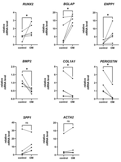 According to the qPCR assay, isolated OB cells express their specific markers both in control conditions and in an osteogenic medium (Figure 5). They express BGLAP (bone gamma-carboxyglutamate protein), which encodes osteocalcin, the most abundant protein in bone [14], RUNX2, the osteoblasts master regulator [15], and SPP1, which encodes osteopontin (OPN), the protein, that is known to be expressed in bone and bone marrow by osteoblastic and osteoclastic precursor cells, multi-nucleated osteoclasts, osteocytes, and osteoblasts [16], ENPP1, encoding ectonucleotide pyrophosphatase/phosphodiesterase which helps to regulate bone and cartilage mineralization by producing inorganic pyrophosphate [17], PERIOSTIN, BMP2, and COL1A, which encodes type 1 collagen. OB cells also express ACTA2, a marker gene for mesenchymal cells. ENPP1, BGLAP, and its regulator RUNX2 were upregulated in OM, while PERIOSTIN, BMP2, and COL1A1 were downregulated in OM. We have not found significant changes in SPP1 and ACTA2 levels in response to osteogenic differentiation, although there was a tendency toward an upregulation of SPP1 in OM.