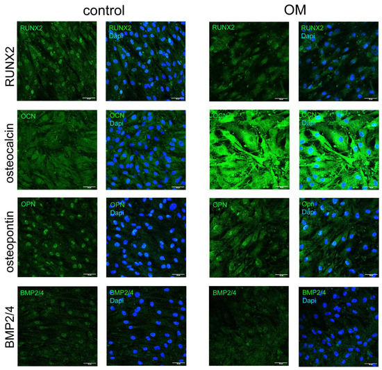 To verify if OB cells really have an osteogenic phenotype, we performed immunocytochemical staining to OPN (osteopontin), RUNX2, BMP2/4, and osteocalcin. OB cells do express RUNX2, osteopontin, BMP2/4, and osteocalcin proteins in control conditions. After cultivation in an osteogenic medium for 96 h, we observed an increase in the level of osteocalcin, a slight increase in the level of osteopontin, and a decrease in the level of BMP2/4 by immunocytochemical staining (Figure 6).