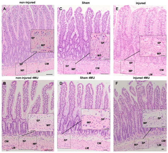 4-MU treatment did not yield major histological changes in the mucosal and serosal epithelium of the sham-operated and injured groups (Figure 1C–F). The morphometric analysis of intestinal cross-sections (Supplementary Table S1) revealed that the mucosal layer thickness and villi height were significantly reduced in the injured group, when compared to non-injured (p < 0.01) and the sham-operated group (p < 0.001). The density of villi also increased when compared to the same groups (p < 0.01).