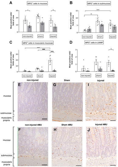 Myeloperoxidase (MPO) immunohistochemical staining revealed a similar number of neutrophils per field in the mucosal layer of non-injured, sham-operated and injured animals (Figure 2A,E,G,I). 4-MU induced a reduction in neutrophil infiltration in the mucosa in all groups, which was statistically significant in the non-injured and injured groups (Figure 2A,F,H,J). In the submucosal layer of sham-operated and injured groups, the number of neutrophils significantly increased with respect to the non-injured (p < 0.0001 and p < 0.01, respectively; Figure 2B,E,G,I), and was unchanged by 4-MU (Figure 2B,F,H,I). In the muscularis propria, the number of MPO+ cells per field significantly increased in the injured (p < 0.0001) with respect to non-injured and sham-operated groups (Figure 2C,E,G,I). IRI-induced neutrophil infiltration in the muscularis propria was significantly reduced after 4-MU treatment (p < 0.0001) (Figure 2C,F,H,K). 4-MU treatment reduced, although not significantly, neutrophilic infiltration in the muscularis propria both in non-injured and sham-operated groups (Figure 2C,F,H,K). 4-MU reduced the number of neutrophils infiltrating myenteric ganglia in all groups, which was statistically significant in the non-injured and injured, but not in the and sham-operated group (Figure 2D–L). Overall, these results suggest that 4-MU shows protective properties in the muscularis propria of injured animals against neutrophilic infiltration. In addition, in the mucosa, muscularis propria and myenteric ganglia, 4-MU influences neutrophilic recruitment in all experimental conditions.