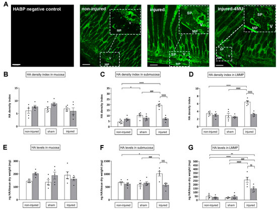 In cross-section of non-injured rat small intestine, HA staining was found in the lamina propria mucosae of the epithelium. In the submucosal layer, a particularly remarkable HA labeling was found in the tunica media and adventitia of large and medium-sized vascular vessels. A fainter HA labeling was found in the longitudinal muscle and myenteric plexus (LMMP) with respect to the rest of the intestinal wall (Figure 3A). HA staining in the different layers of non-injured intestinal preparations reflected values of HA density index (Figure 3B–D) and HA levels (Figure 3E–G). In sham-operated animals, HA density index significantly increased in the submucosal layer with respect to values obtained in non-injured animals (p < 0.05), but remained unchanged in the mucosa and in LMMPs (Figure 3A,C). These data were confirmed by ELISA assay, except for HA density index enhancement in the submucosal layer (Figure 3E–G). In both non-injured and sham-operated groups, 4-MU treatment did not significantly influence either HA density index or HA levels (Figure 3B–G). In injured animals, HA density index and levels in the submucosal layer and LMMPs significantly increased with respect to both the non-injured and sham-operated group (density index: p < 0.0001 and p < 0.01 and HA levels: p < 0.05 and p < 0.001, respectively) (Figure 3C–G), and remained unchanged in the mucosa layer (Figure 3A,B,E). In the submucosal layer and LMMPs, 4-MU significantly reduced IRI-induced enhancement of both density index and HA levels (p < 0.001) (Figure 3C–G).