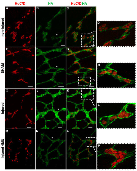 In whole-mount preparations of the rat small intestine submucosa, HA staining was found on the surface of submucosal ganglia and along interconnecting fibers (Figure 4A–P). In addition, co-localization with the pan-neuronal marker HuC/D demonstrated a faint HA labeling in submucosal neuron cytoplasm and a more intense labeling in the perineuronal space (Figure 4D,H,L,P). In preparations obtained from injured animals, HA staining was enhanced on ganglia surfaces, in neuron cytoplasm and in the perineuronal space if compared to non-injured and sham-operated groups (Figure 4I–K), and was attenuated by 4-MU treatment (Figure 4M–O).