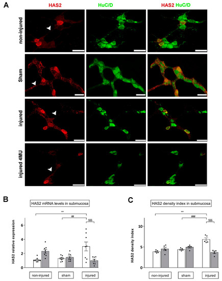 In the submucosal layer whole-mount preparations obtained from non-injured animals, HAS2 staining was observed in the cytoplasm, nuclear and cytosolic membrane of a few large and medium ovoid neurons and along interconnecting fibers (Figure 5A). In the submucosal layer, HAS2 mRNA levels significantly increased after IRI with respect to both non-injured and sham-operated preparations (p < 0.01) (Figure 5C). Such enhancement was significantly reduced by 4-MU treatment (p < 0.001 vs. IRI). Accordingly, in the submucosal plexus of the injured group, the density index of HAS2 staining was significantly higher with respect to values obtained in the non-injured and sham-operated groups (p < 0.0001) (Figure 5C). Such enhancement was significantly reduced after 4-MU treatment with respect to the relative untreated injured group (p < 0.001) (Figure 5C). 4-MU treatment did not modify HAS2 density index and mRNA expression in both non-injured and sham-operated preparations (Figure 5B,C).