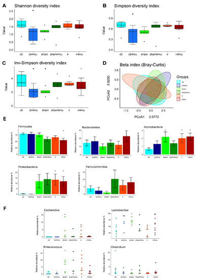 4—MU treatment alters the composition of bacterial gut microbiome after IRI injury. (A–C) Estimation of microbial community α-diversity by Shannon, Simpson and inverse-Simpson indexes. Black dots represent the outliers. * p < 0.05, vs control group by ANOVA with Duncan post hoc test. (D) Principal Coordinates Analysis (PCoA) plot illustrating gut microbiome β-diversity calculated using the Bray–Curtis dissimilarity. After analysis of similarities (ANOSIM), no significant differences were observed among the different experimental groups. Values are expressed as mean ± SEM. * p < 0.05 by ANOVA with Duncan’s post hoc test with respect to non-injured. (E) Relative abundance, expressed as percentage of total sequences of selected phylum and genus (F), identified by NGS of the bacterial 16S mRNA in the different experimental groups. Values are expressed as mean ± SEM. * p < 0.05 by ANOVA with Duncan’s post hoc test with respect to non-injured; # p < 0.05 by ANOVA with Duncan’s post hoc test with respect to injured.