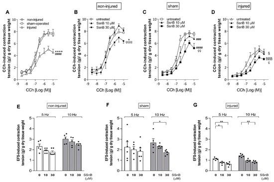 SsnB induced a significant dose-dependent downward shift of the concentration–response curve to CCh both in the injured (SsnB 10 µM: p < 0.05; SsnB 30 µM: p < 0.0001, respectively) and sham-operated (SsnB 10 µM: p < 0.001; SsnB 30 µM: p < 0.0001, respectively) groups (Figure 8C–D). In the non-injured group, SsnB decreased the Emax of the CCh concentration–response curve only at the higher concentration tested (SsnB 30 µM: p < 0.05 with respect to non-injured values, and p < 0.0001 with respect to the curve in the presence of SsnB 10 µM). SsnB did not influence the potency of CCh concentration–response curves as suggested by the similar EC50 values obtained in the different experimental groups, with or without SsnB at both concentrations tested (Supplementary Table S2).