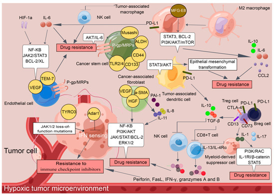 As reported previously, the bidirectional interactions between tumor cells and their surroundings form the TME. The TME consists of tangible components such as malignant cells, tumor-associated immune cells, cancer-associated fibroblasts (CAFs), cancer stem cells (CSCs), endothelial cells, and adipocytes [15]. Biochemical components, including cytokines and cell adhesion molecules (CAMs), are also present in the TME [16]. Herein, we provide a brief overview of cellular and molecular immunosuppressive networks in a tumor-supportive physical and chemical TME, especially the immune cellular and nonimmune cellular components of the TME, and their contribution to drug resistance.