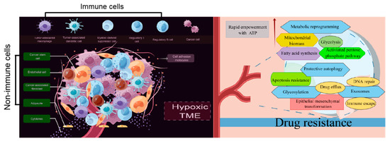 Cancer is one of the most serious diseases and the second leading cause of death globally [1]. The use of chemotherapeutic drugs, immune checkpoint inhibitors (ICIs), and molecular targeted inhibitors represents an optimal strategy for cancer therapy [2,3,4]. Unfortunately, drug resistance has become increasingly common and contributes to tumor metastasis and local recurrence [5]. Elucidating the underlying mechanisms that promote drug resistance and establishing effective strategies to overcome drug resistance have long been urgent issues in cancer treatment. A steady efflux of drugs is essential for addressing the aggressive biological behaviors of tumor cells that are resistant to chemotherapy [6]. Apoptosis resistance and the DNA repair response also contribute to the development of drug resistance [7,8]. It is recently documented that genetic variability in single tumor cells, also known as intratumor heterogeneity (ITH), can lead to “cellular plasticity”, which has received considerable attention [9,10]. The properties of cellular plasticity enable tumor cells to reversibly switch their phenotypes or states between drug resistance and drug sensitivity and then escape and survive therapeutic challenges [11]. More surprisingly, tumor cells with cellular plasticity create a favorable tumor microenvironment (TME) in which they acquire distinct resistance to therapeutic drugs by reinventing themselves with metabolic alterations and aberrant epigenetic modifications, thus evolving a strategy to avoid cell death [12,13]. Therefore, experts are becoming more willing to accept that these mechanisms, including drug efflux, apoptosis resistance, and DNA repair response, may comprise only one chapter in the story of drug resistance, as tumor cells are very good at embellishing themselves to adapt to ever-changing environments [14]. Here, we focus on determinants that promote drug resistance in the TME, including exosomes, metabolic reprogramming, protein glycosylation, and autophagy, considering their implications for the development of successful therapeutic strategies.