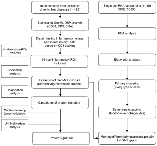 The right part of Figure 1 depicts a flow diagram of the scRNA-seq analysis. The analysis was performed using the GSE136103 dataset and the Seurat package version 4.0.5 (https://satijalab.org/seurat/index.html accessed on 1 January 2022). Pre-processing followed the GSE136103 method. For shared nearest neighbor clustering, variable features were determined using the variance stabilizing transformation (VST) of the selection method and 2000 variable counts. After scaling the data, a principal component analysis (PCA) was performed using the identified variable features. With the analyzed principal components, the optimal dimensions were analyzed using an elbow plot. According to the determined dimensions and principal components, single cells were clustered and visualized as a t-distributed stochastic neighbor embedding (t-SNE) graph. Clusters were identified using markers used to divide the clusters. Primary clustering was performed using data from five healthy and five cirrhotic patients. Secondary clustering was performed using cells presumed to be MPs. To identify the distribution in which cells express genes that code for differentially expressed proteins detected by DSP, the corresponding genes were marked in the secondary cluster using SCINA (semi-supervised category identification and assignment).