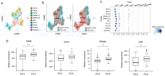 Combined analysis of scRNA-seq with DSP. (A) Reconstituted t-SNE graph for intrahepatic MPs using GEO datasets (GSE136103). (B) Marking differentially expressed proteins between early-stage fibrosis and advanced-stage fibrosis from DSP data to reconstituted t-SNE graph. Left panel is the graph that marked proteins highly expressed in F0–2, and right panel is the graph that marked proteins highly expressed in F3–4. (C) Scaled gene expression across every cluster of MPs. (D) Gene expression analysis with snap-frozen liver tissues using NanoString nCounter expression analysis. The expression levels of CD68, CD74, TREM2, and CD9 were compared between livers with early fibrosis and advanced fibrosis. Significance was indicated with ** p value < 0.01, *** p value < 0.001.