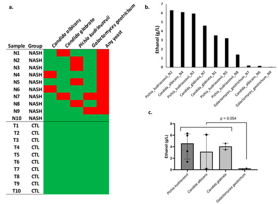 Isolation and ethanol production by yeast strains in an in vitro experimental model. (a) Yeast species isolated from each sample (N1, Patient Nash1, etc.). NASH: nonalcoholic steatohepatitis, CTL: healthy controls. Red square: isolation of yeast in culture. Green: no yeast isolated. (b) Ethanol production for each strain in an in vitro experimental model (Sabouraud medium, high-performance liquid chromatography); each strain was named with the species and the patient (for instance, Pichia_kudriavzevii_N2 is a strain isolated from patient Nash2). (c) Comparison between species.