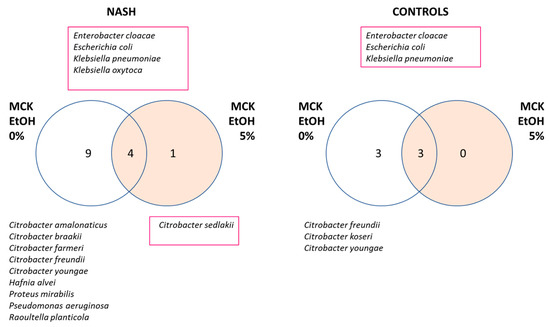 Several Citrobacter species sensitive to 5% ethanol were found in both NASH patients and controls. In addition, several ethanol-sensitive species were specific to NASH, such as Hafnia alvei, Proteus mirabilis, Pseudomonas aeruginosa, and Raoultella planticola. It is interesting to note that Pseudomonas aeruginosa and Proteus mirabilis are well-known human pathogens, while Hafnia alvei and Raoultella planticola are increasingly recognized as emerging human pathogens [14,15].