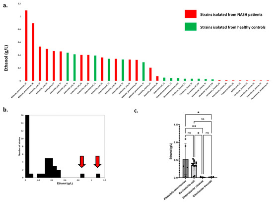 In an in vitro experimental model, ethanol production was assessed for 36 available bacterial strains isolated on MacConkey medium corresponding to 11 Gram-negative species (Figure 4a, Supplementary Table S6). The six strains producing the highest levels of ethanol were all isolated from NASH patients. Surprisingly, two strains producing exceptional amounts of ethanol (Figure 4b, red arrow) were isolated from NASH patients and corresponded to the Klebsiella pneumonia species. At the species level, only four species produced more than 0.2 g/L: K. pneumoniae, E. coli, Hafnia alvei, and Klebsiella oxytoca. A visual examination of ethanol production according to the strains (Figure 4a) showed three strain populations, namely, low ethanol producers (<0.2 g/L), strains with high production (>0.2 g/L), and strains with exceptional ethanol production (>0.6 g/L).