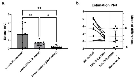Ethanol production by yeast compared to enterobacteria isolated from NASH patients. (a) In Sabouraud’s medium (n = 10 yeast strains), the concentration of ethanol produced by yeast was 10-fold higher than that produced by enterobacteria (MacConkey’s medium, n = 21 bacterial strains), including Klebsiella pneumoniae, which produces a lot of alcohol (HiAlc Kpn, 1.09 g/L for the strain with maximum ethanol production). In a secondary analysis using 10% D-fructose restricted medium (n = 9 yeast strains, Galactomyces_geotrichum_N9 was lost before this secondary experiment), substantial ethanol production was observed. * p < 0.05, ** p < 0.005. (b) For the nine strains for which ethanol production could be assessed on both Sabouraud’s and 10% D-fructose, ethanol production was significantly higher on Sabouraud’s medium (paired two-tailed t-test, p = 0.015).