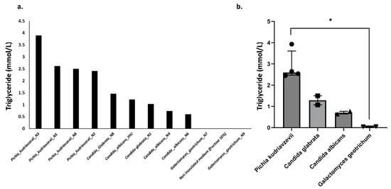Triglyceride production by yeast strains. A value of 0.036 mmol/L was measured for ultrapure water and considered the background value. The values provided in the figure took into account this background value. (a) Triglyceride production for each strain, (b) Comparison between species. * p < 0.05.