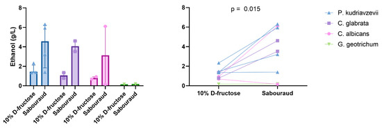 We then tested the functional link between fructose consumption, specifically associated with NASH in the literature [2], and ethanol production by an in vitro model. In this model, strains were grown on a medium containing only water and 10% D-fructose. Only nine strains were studied. Indeed, the Galactomyces_geotrichum_N9 strain was lost despite several culture attempts. We observed that 10% D-fructose and water were sufficient for Candida and P. kudriavzevii to produce ethanol levels higher than the best HiAlc K. pneumoniae (up to >2 g/L, Figure 5, Supplementary Table S5). In particular, all four strains of P. kudriavzevii produced more than 1 g/L of ethanol from this fructose-restricted medium. For the nine strains for which ethanol production could be assessed on both Sabouraud’s medium and 10% D-fructose medium, ethanol production was significantly higher on Sabouraud’s medium (mean ± SD, 3.49 ± 2.46 g/L vs. 1.16 ± 0.61 g/L, paired two-tailed t-test, p = 0.015, Figure 7).