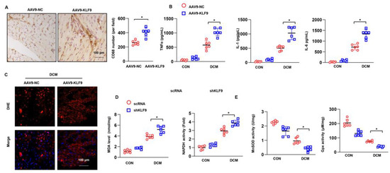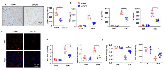 3.5. KLF9 Knockdown Suppressed Inflammation and Oxidative Stress in DCM