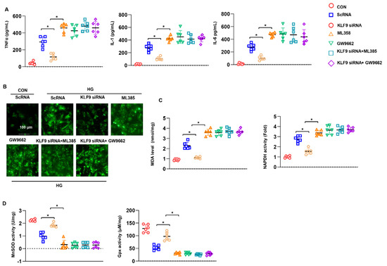 3.3. KLF9 Exacerbates Inflammation and Oxidative Stress in DCM