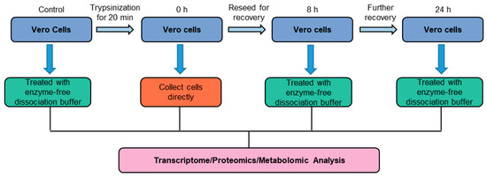 Transcriptomic, metabolomic, and proteomic analyses were undertaken for the cells treated with different detachment processes. The Vero cells were divided into three groups. The first group (Group 1) was detached with trypsin at 37 °C. The cells collected immediately after detachment were set to 0 h, and the detached cells were placed back into the cell incubator for 8 h. After the cells were detached with a nonenzymatic detachment solution and collected at the 8 h timepoint, the cells after trypsinization at 37 °C were further cultured for 24 h, and the cells were detached with a nonenzymatic detachment solution and collected at the 24 h timepoint. The second group (Group 2) was detached with TrypLE at 37 °C, then we set the cells collected immediately after detachment as 0 h, placed the detached cells back into the cell incubator for 8 h, and detached the recovered cells with a nonenzyme detachment solution. After 8 h, we continued to culture the cells detached with TrypLE detachment solution at 37 °C for 24 h, and then detached the cells with a nonenzyme detachment solution at the 24 h timepoint. For the third group (Group 3), we used a 4 °C TrypLE detachment solution at 25 °C detachment; the cells collected immediately after detachment were set to 0 h, and the detached cells were placed back into the cell incubator for 8 h. The cells collected after detachment with the nonenzyme detachment solution were set to 8 h, and detached with TrypLE detachment solution at 4 °C. After the cells were cultured for 24 h, the collected cells were detached with a nonenzymatic detachment solution and set to 24 h. In addition, Vero cells were detached with an enzyme-free detachment solution at 37 °C, and the immediately harvested cells were set as the control group. The experimental process and group settings are shown in Figure 1.
