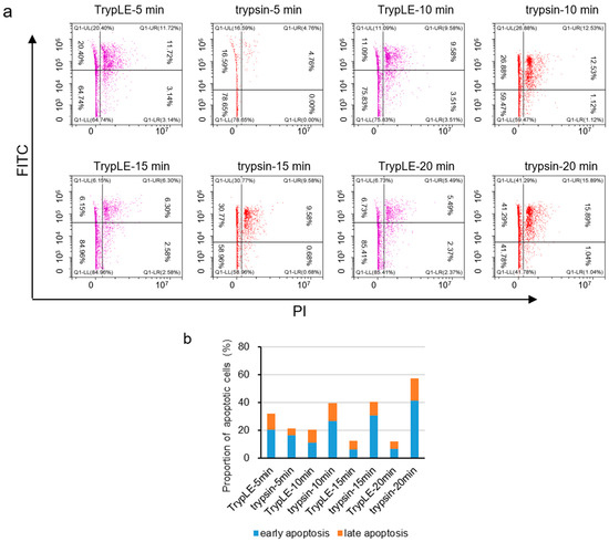 Animal-based enzymes promote cell apoptosis compared with animal-origin-free enzymes. (a) Animal-based enzymes and animal-origin-free enzymes at 37 °C resulted in apoptosis. A total of 5 × 105 cells were plated in each well of a six-well plate, and, after culturing for 12–24 h, the cells were detached with animal-based enzymes (trypsin) or animal-origin-free enzymes (TrypLE) at 37 °C for 5 min, 10 min, 15 min, or 20 min, and FITC (5-Fluoresceinisothiocyanate)/PI (Propidium Iodide) dual-color labeling flow cytometry was performed. Cells stained only with FITC represent early apoptotic cells, and cells stained only with PI represent cells with late apoptosis. (b) Quantification column chart of Figure 2a.